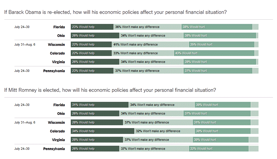 The dominant fact of this election can be seen from a recent Quinnipiac University/New York Times/CBS News poll of six swing states .  The key question in that poll asked voters about the effect that each candidate’s policies would have on their personal situation.  The results are shown below: